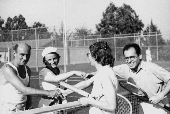 With the rise of the Nazis, Schoenberg fled Europe to take up residence in America. He was removed from his position at the Prussian Academy of the Arts in 1933 and his work was labelled "degenerate" and "Bolshevist" and banned from performance throughout German-controlled lands. After a brief move to New York, where he found the weather not to his liking, Schoenberg moved across the country to 116 North Rockingham Avenue in Los Angeles, where he took a teaching position at UCLA; among his students was John Cage. In Hollywood, Schoenberg lived next door to Shirley Temple; often played ping pong and tennis, and more tennis with the likes of George Gershwin (who painted a portrait of Schoenberg) and the Marx Brothers; and began a warm friendship with Charlie Chaplin. |