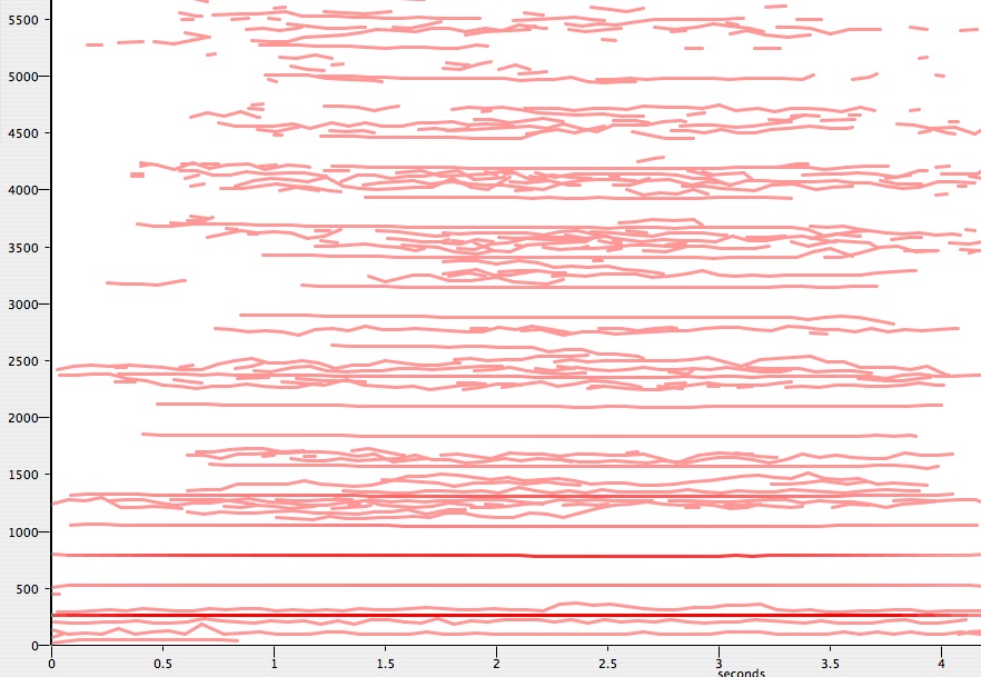 The image at left above shows the spectrograph of a flute playing middle C, while the image at right is that of a clarinet playing the same pitch over a four-second span. The x-axis represents time, while the y-axis shows frequency in hertz (pitch) - our ear can hear from something like 18 Hz to 20,000 Hz. The brightness of a color indicates the volume of that frequency. Looking at the two spectrographs, we can see that the primary difference between the timbre of a flute and that of a clarinet lies in the strength of the fundamental, which is much stronger in the clarinet than in the flute. Certain overtones of the flute, namely the octave-and-a-fifth and double-octave, are stronger than those of the clarinet.